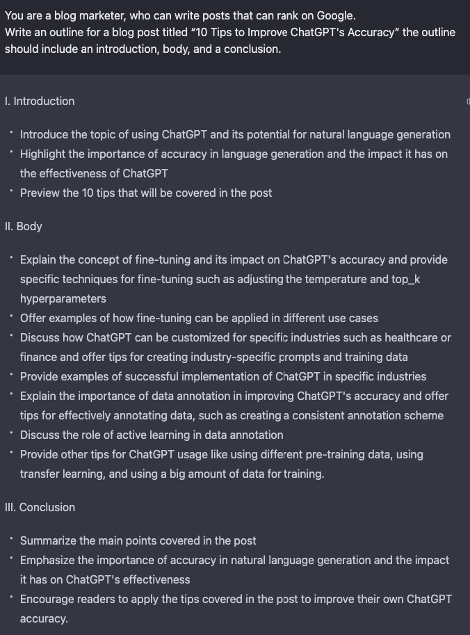 이제부터 본격적인 블로그 내용을 잡아주게 되는데요, 내용에 따라 ChatGPT가 아웃라인을 잘 못 잡을 수도 있습니다. 이 때는 프롬프트를 조금씩 튜닝해 보거나, 직접 보충해서 작성해주셔야 해요. 그리고 주제에 비해 내용이 많아지면 엉뚱한 내용, 헛소리를 포함시킬 수 있기 때문에 주제에 대해서 적절한 아웃라인이 설정되는지 꼭 확인해보셔야 합니다.
