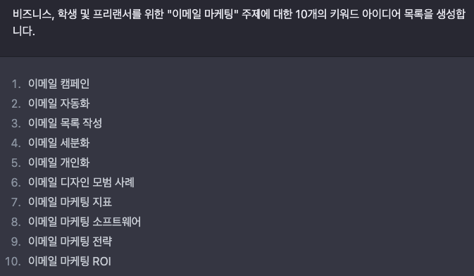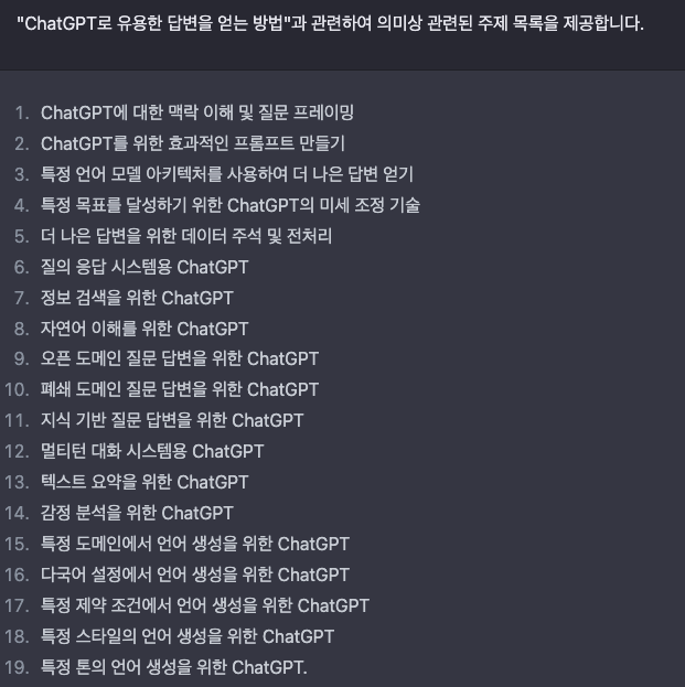 블로그 포스팅을 작성하다 보면 해당 포스팅과 유사한 주제, 심화된 주제로 포스팅을 더 작성하고 싶을 수 있습니다. 이럴 때 유사한 주제를 생성하도록 요청할 수 있습니다. ChatGPT가 여러분의 브레인스토밍을 도울 거예요.