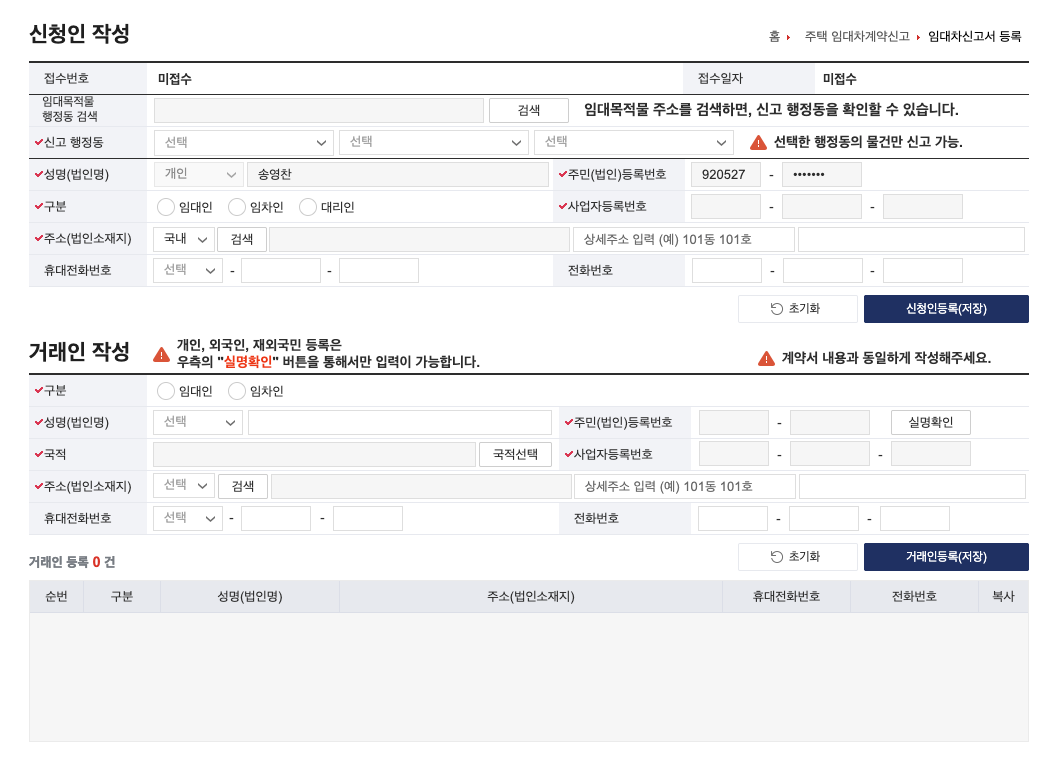 신청인 정보 입력: 계약 당사자(임대인 또는 임차인)의 정보를 입력해요. (예: 성명, 주민등록번호, 주소, 연락처 등)