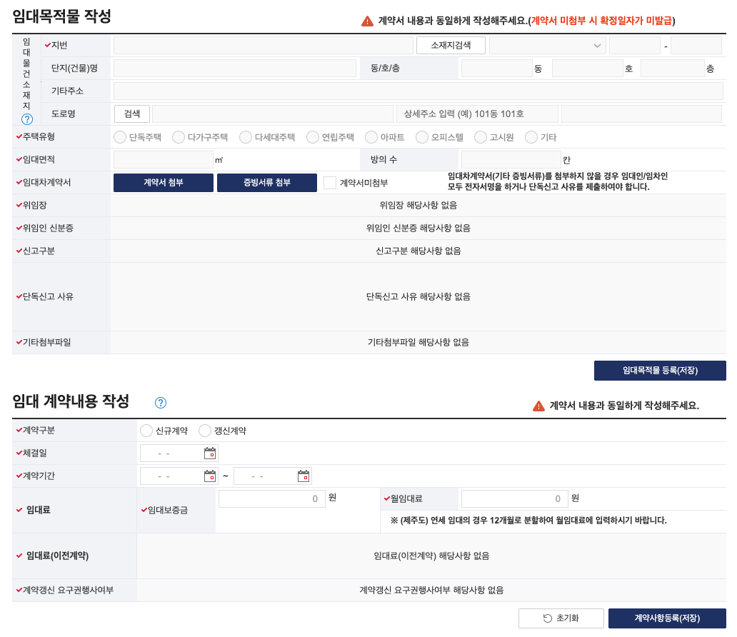- 정확한 정보 입력은 기본! 주소, 계약 내용 등 모든 정보는 계약서와 동일하게, 오타 없이 정확하게 입력해야 나중에 문제가 생기지 않아요.