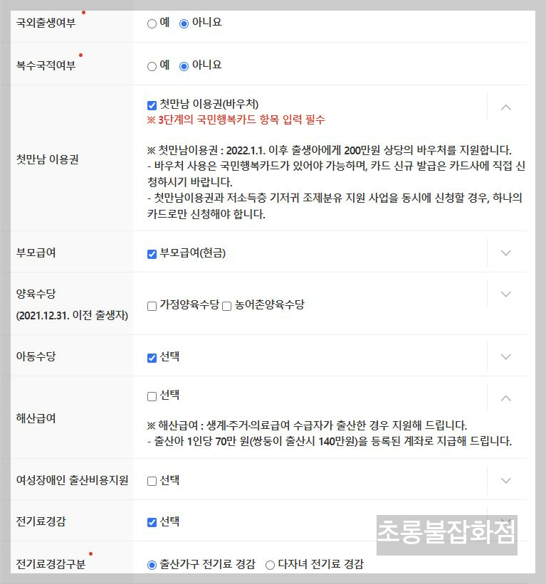 이후 지자체별 출산지원 서비스, 수수료 납부 등을 차례로 진행하시면 되겠습니다.