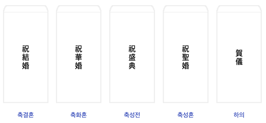 예식장에 가면 축의금 봉투가 준비되어 있어요. 봉투 앞면에 보통 위와 같은 한자로 적혀 있는데, 한자 문구가 없으면 위를 참고하셔서 한자를 적어 주시거나, 한글로 '축결혼'이라고 작성해 주셔도 괜찮습니다.