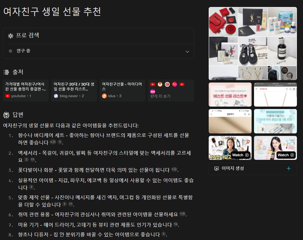 - 다양한 소스를 종합해서 균형 잡힌 정보를 제공해줘요. 블로그, 유튜브, 뉴스기사 등 다양한 소스를 취합해요. 프로버전을 쓰면 십수 개 이상의 다양한 소스를 활용하는 걸 볼 수 있어요.
