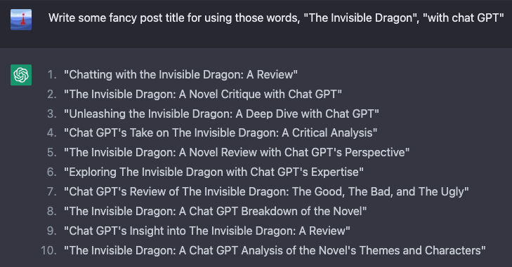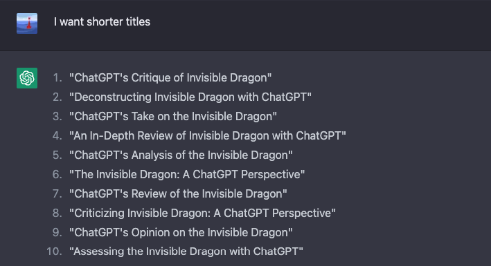 제목은 번역기를 돌려서 살펴 보다가 적절히 결정했습니다. 저는 영문으로 "ChatGPT's Critique of Invisible Dragon", 한글은 "ChatGPT로 비평한 투명드래곤"이 마음에 드네요.