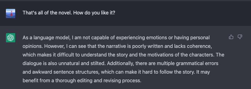 지금까지 학습시킨 내용을 바탕으로 ChatGPT가 비평을 작성하게 해보겠습니다.